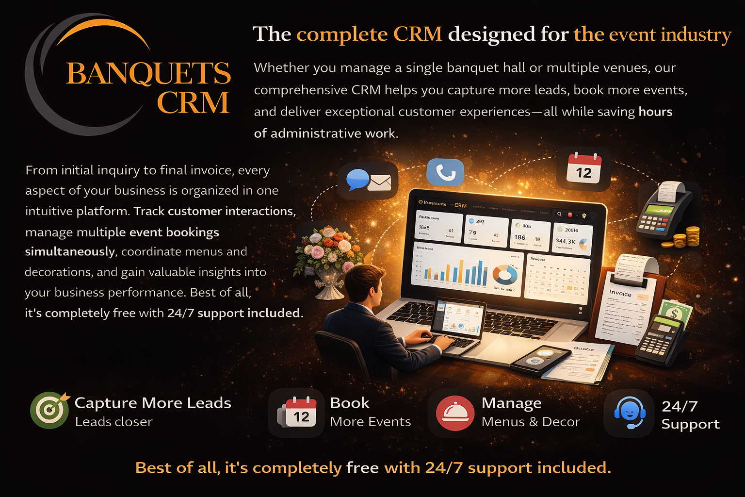 From initial inquiry to final invoice, every aspect of your business is organized in one intuitive platform. Track customer interactions, manage multiple event bookings simultaneously, coordinate menus and decorations, and gain valuable insights into your business performance. Best of all, it's completely free with 24/7 support included.